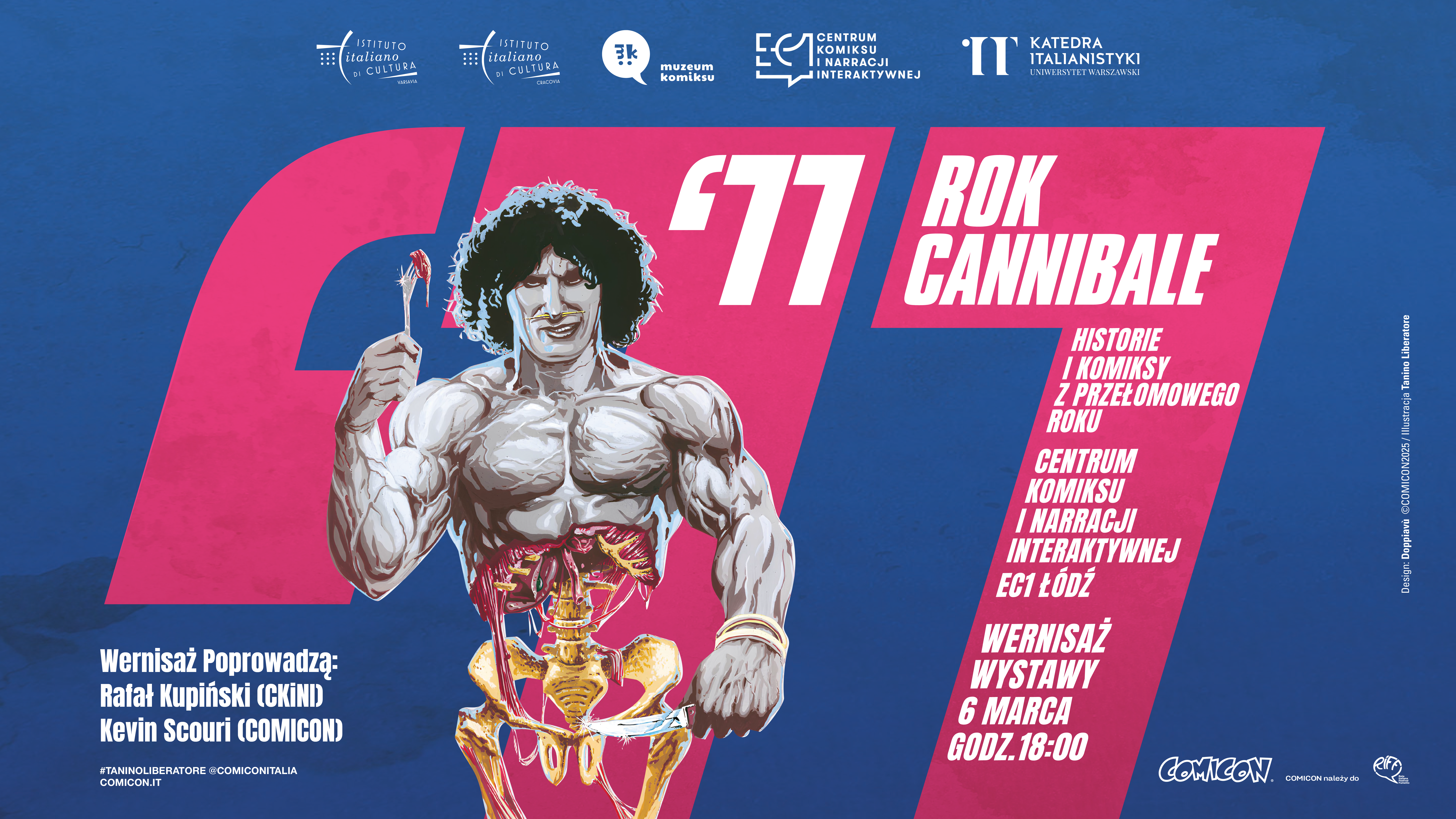 Zapraszamy na wernisaż wystawy „77. Rok „Cannibale”. Historie i komiksy z roku przełomu”, poświęconej przełomowemu momentowi w historii włoskiego komiksu. Emblematem tej rewolucji stało się czasopismo „Cannibale”, założone w 1977 roku przez Stefano Tamburiniego. Zainspirowane amerykańskim undergroundem i przeniknięte libertariańskim duchem Ruchu ’77, narzucało nowy sposób opowiadania: bezkompromisowy, polityczny i graficznie wyrazisty.