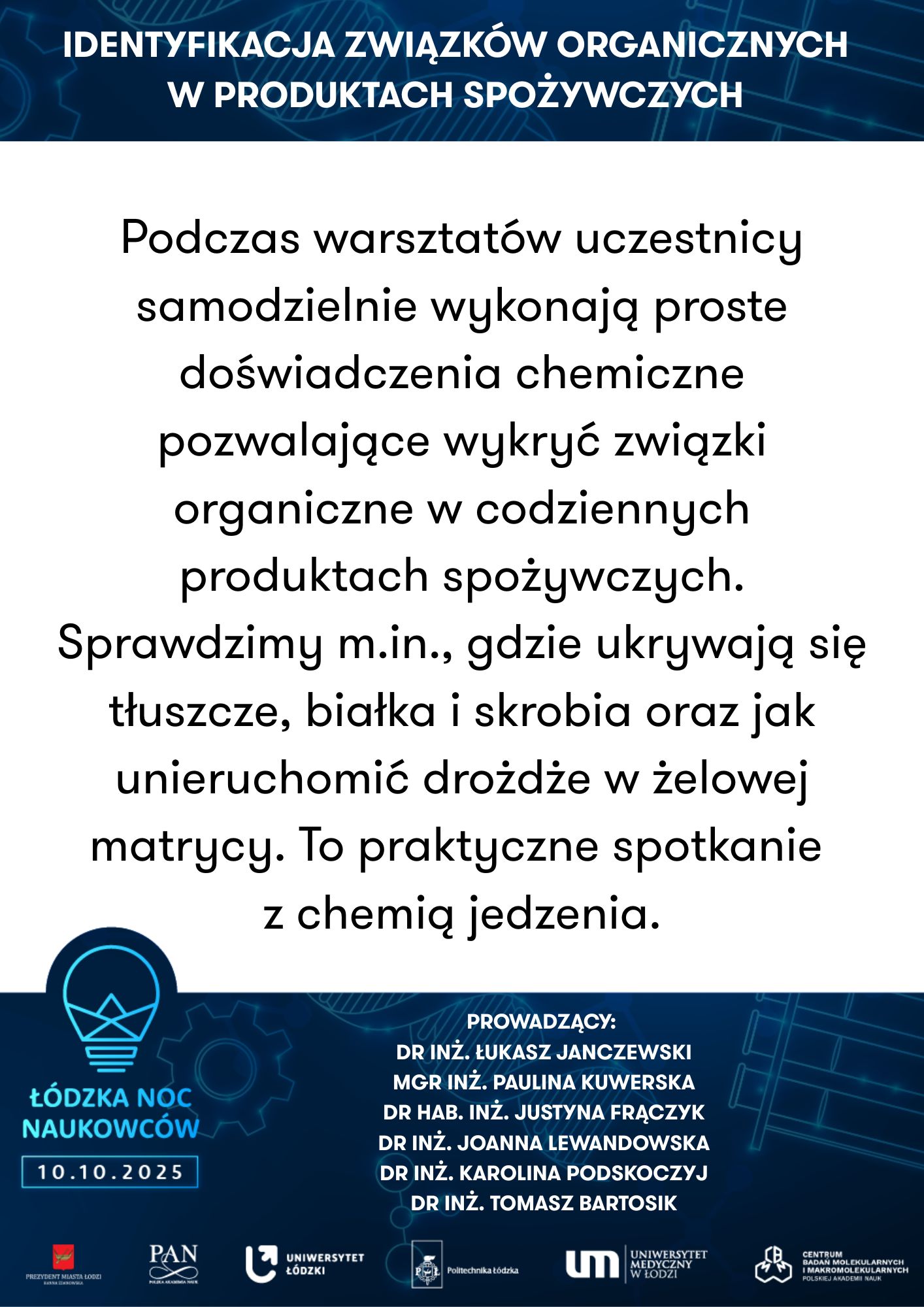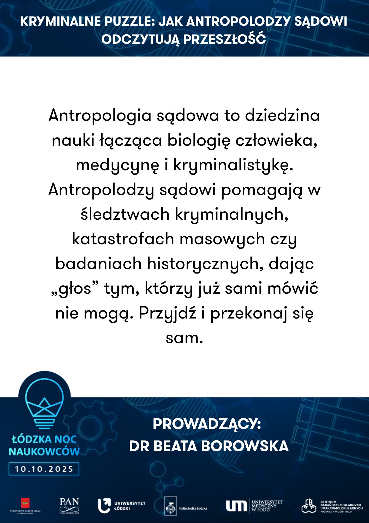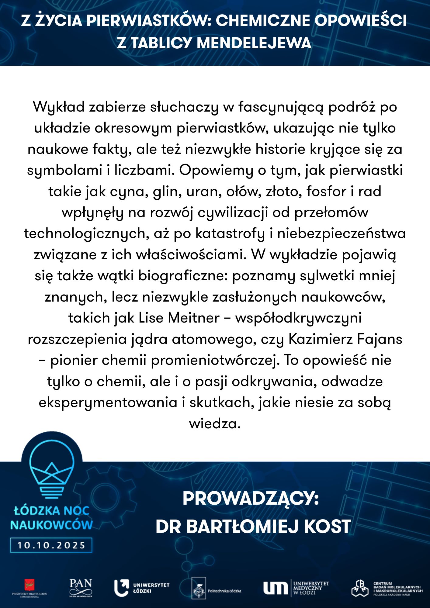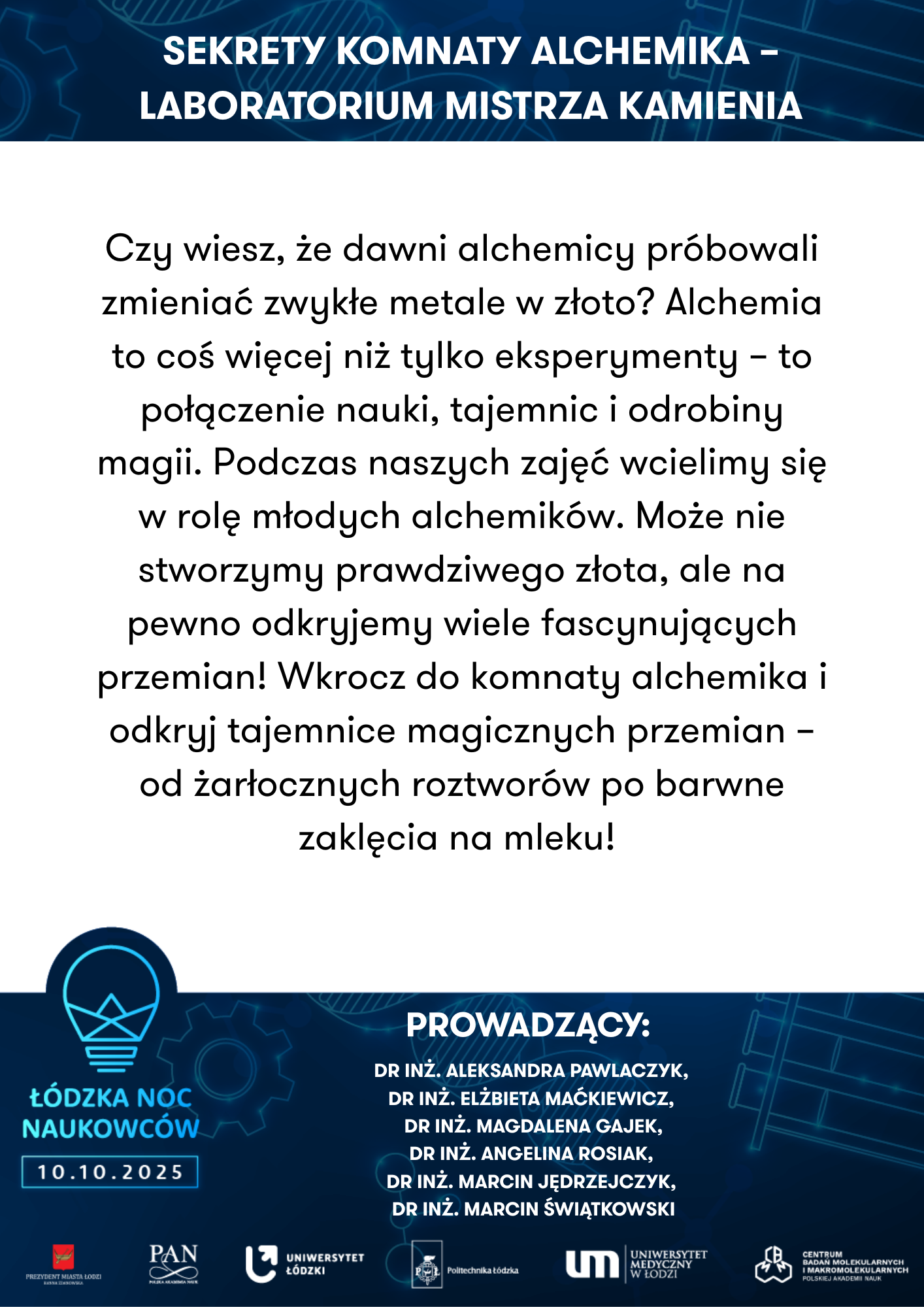 Uniwersytet Łódzki, Wydział Biologii I Ochrony Środowiska, Katedra Antropologii | Powrót do przeszłości – zagadki antropologiczne | Uniwersytet Medyczny w Łodzi, Zakład Genomiki Funkcjonalnej | Od żelaznego gada do lampy lawy - chemiczna podróż pełna eksperymentów | ||