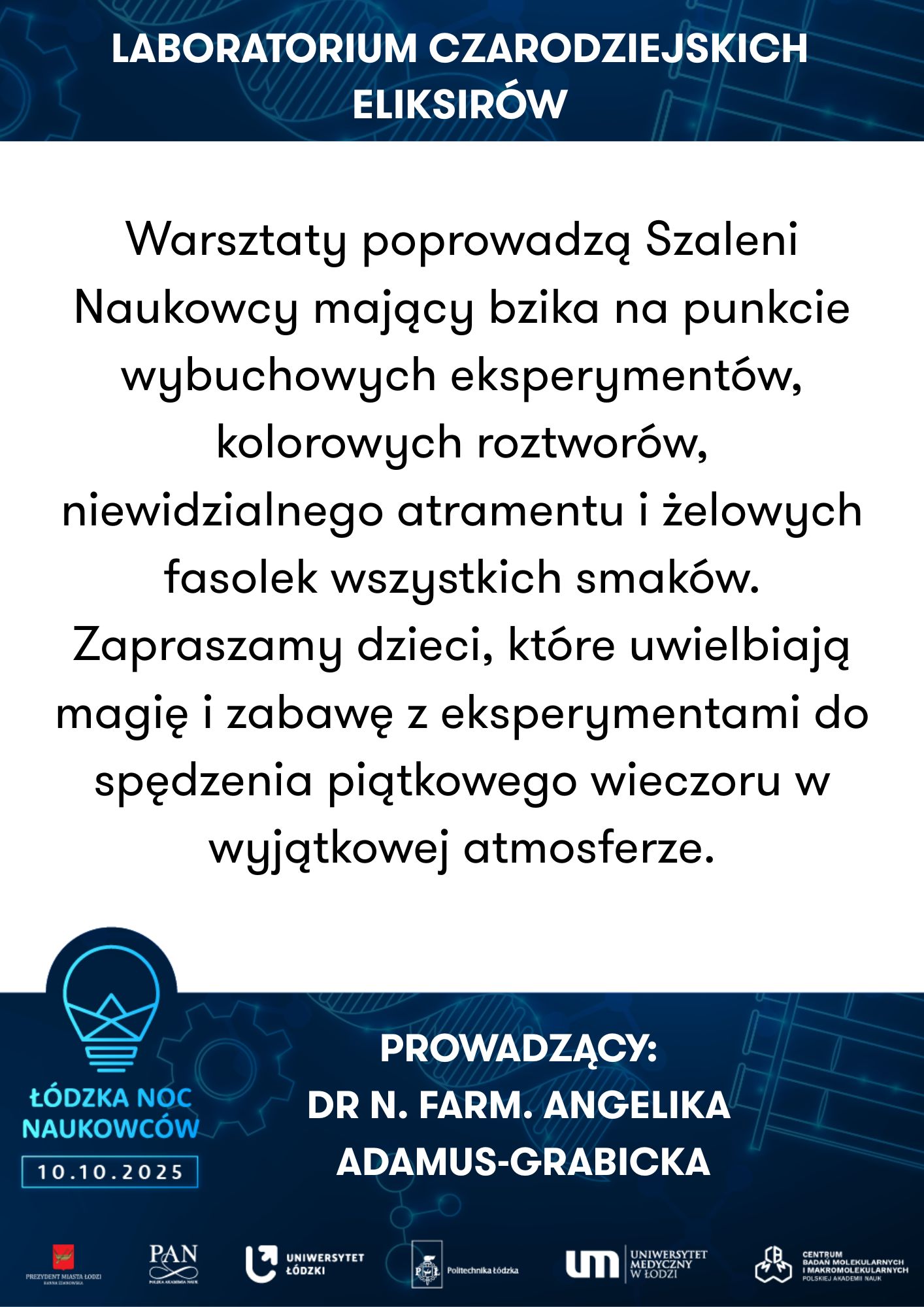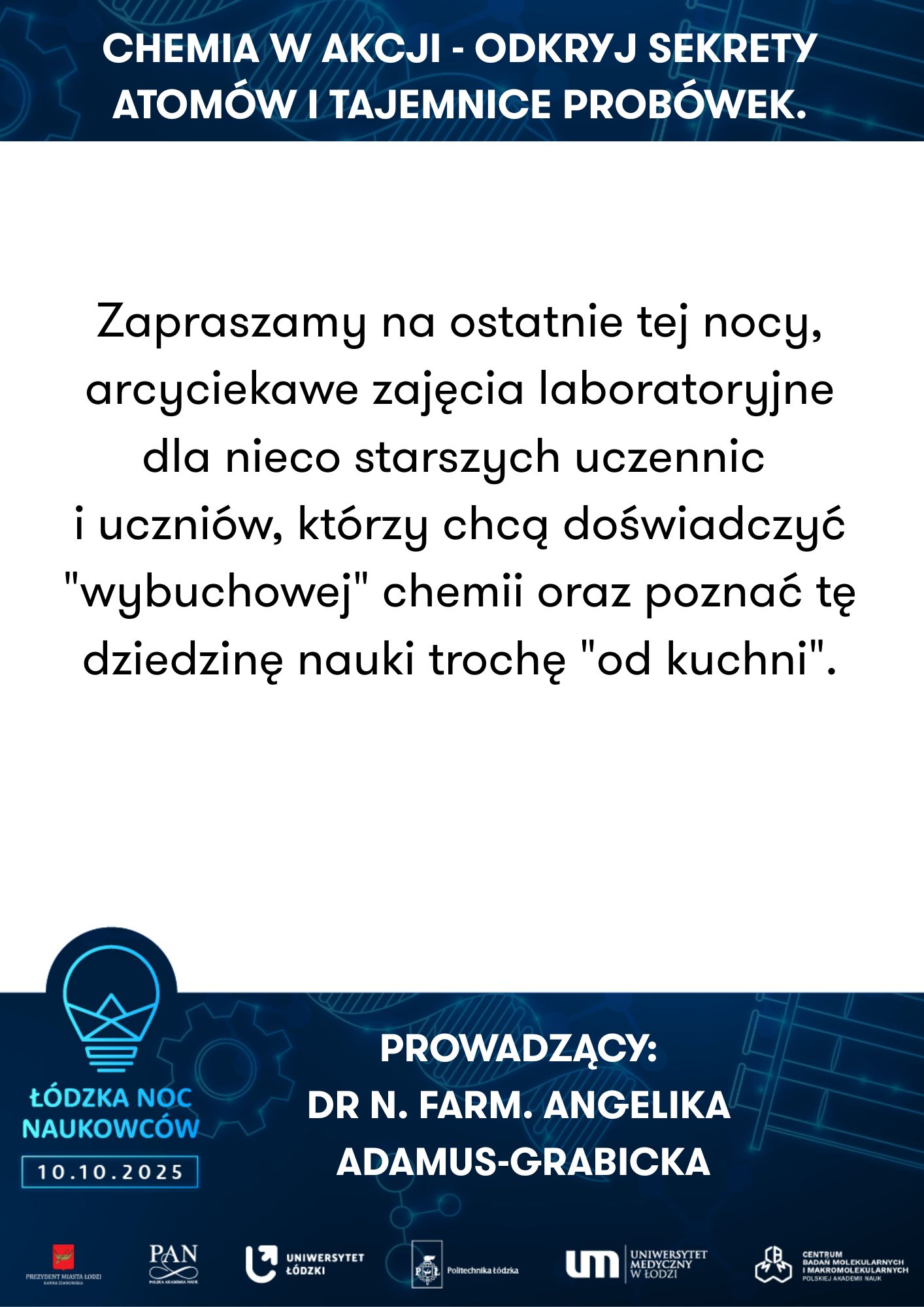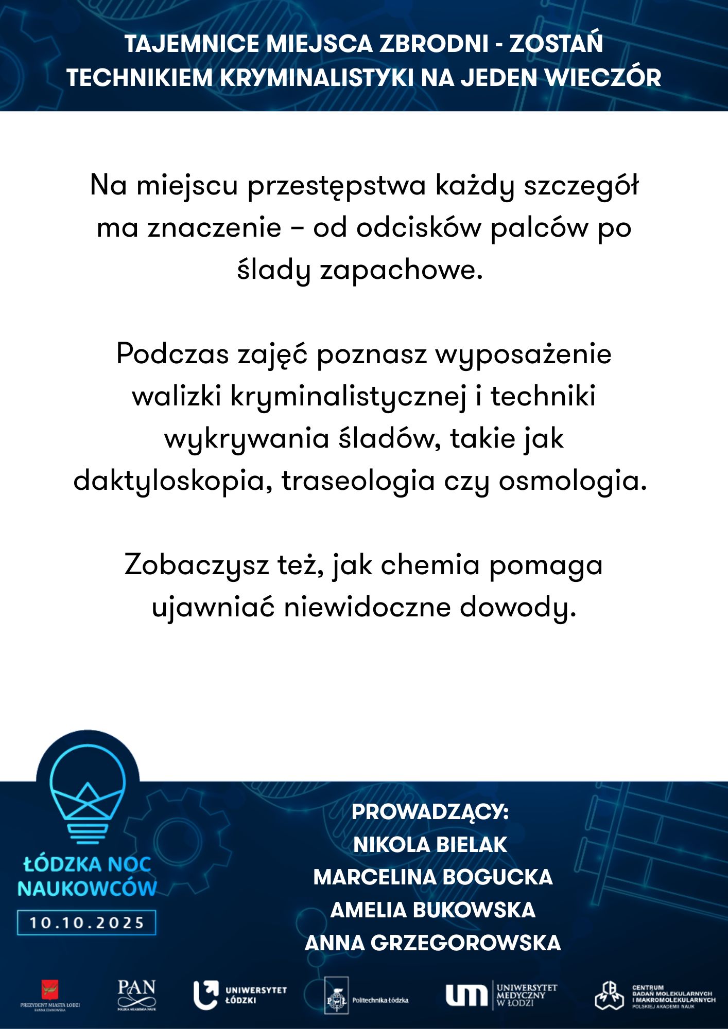 Uniwersytet Łódzki, Wydział Biologii I Ochrony Środowiska, Katedra Antropologii | Powrót do przeszłości – zagadki antropologiczne | Uniwersytet Medyczny w Łodzi, Zakład Genomiki Funkcjonalnej | Od żelaznego gada do lampy lawy - chemiczna podróż pełna eksperymentów | ||