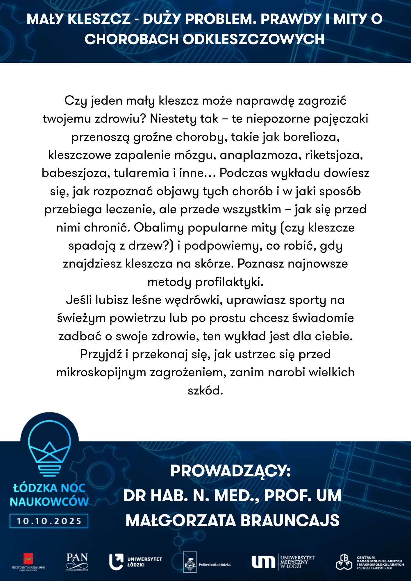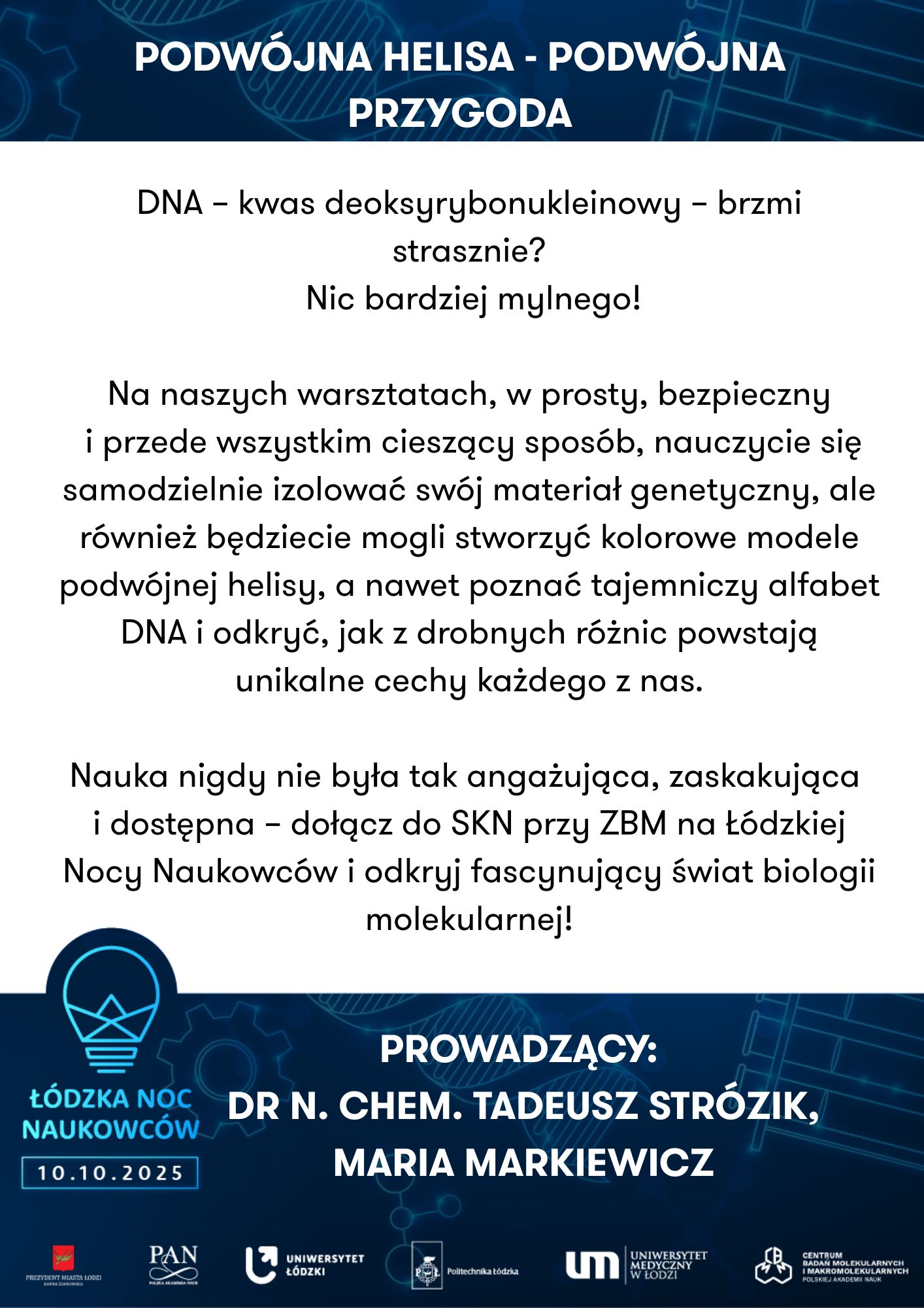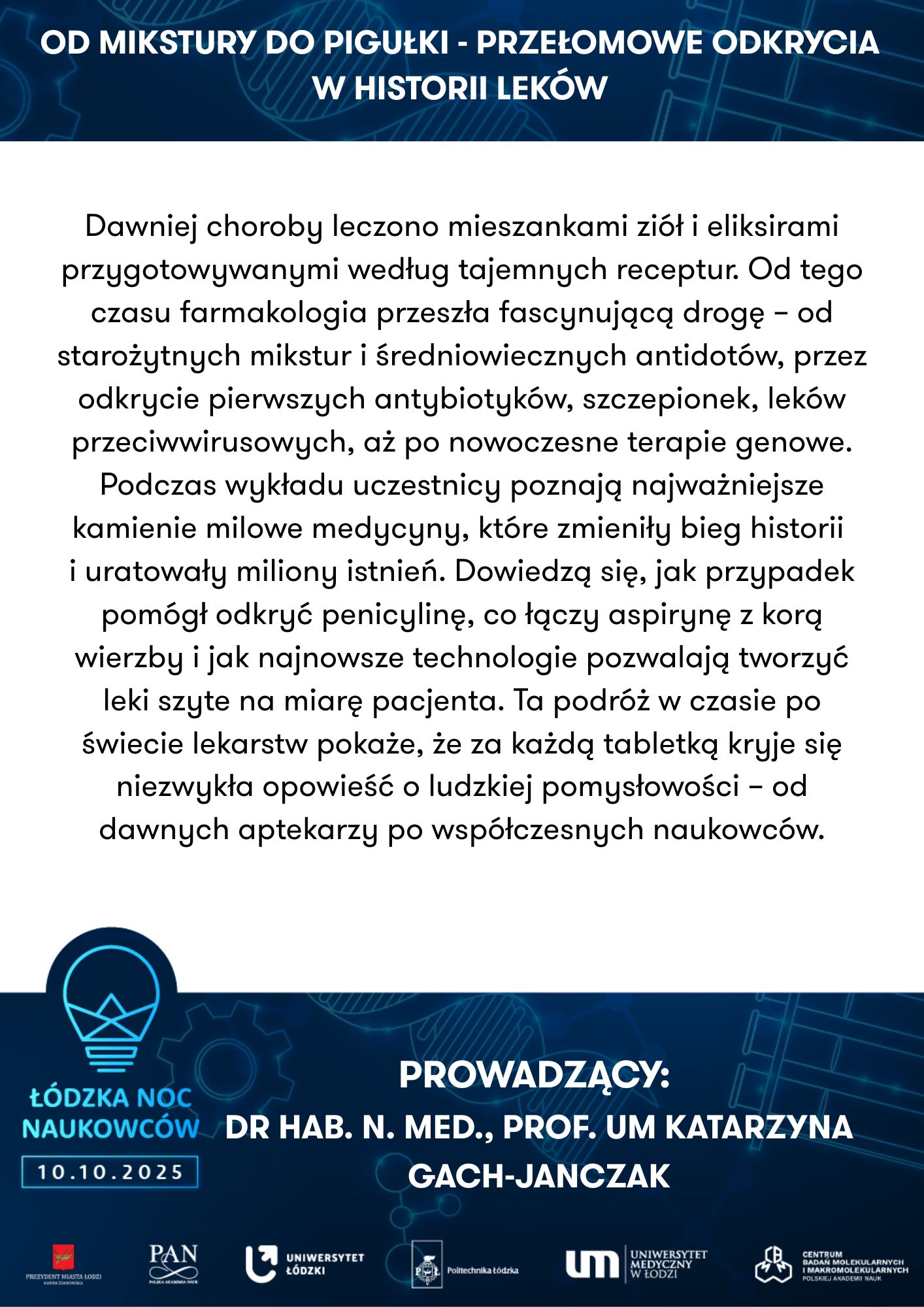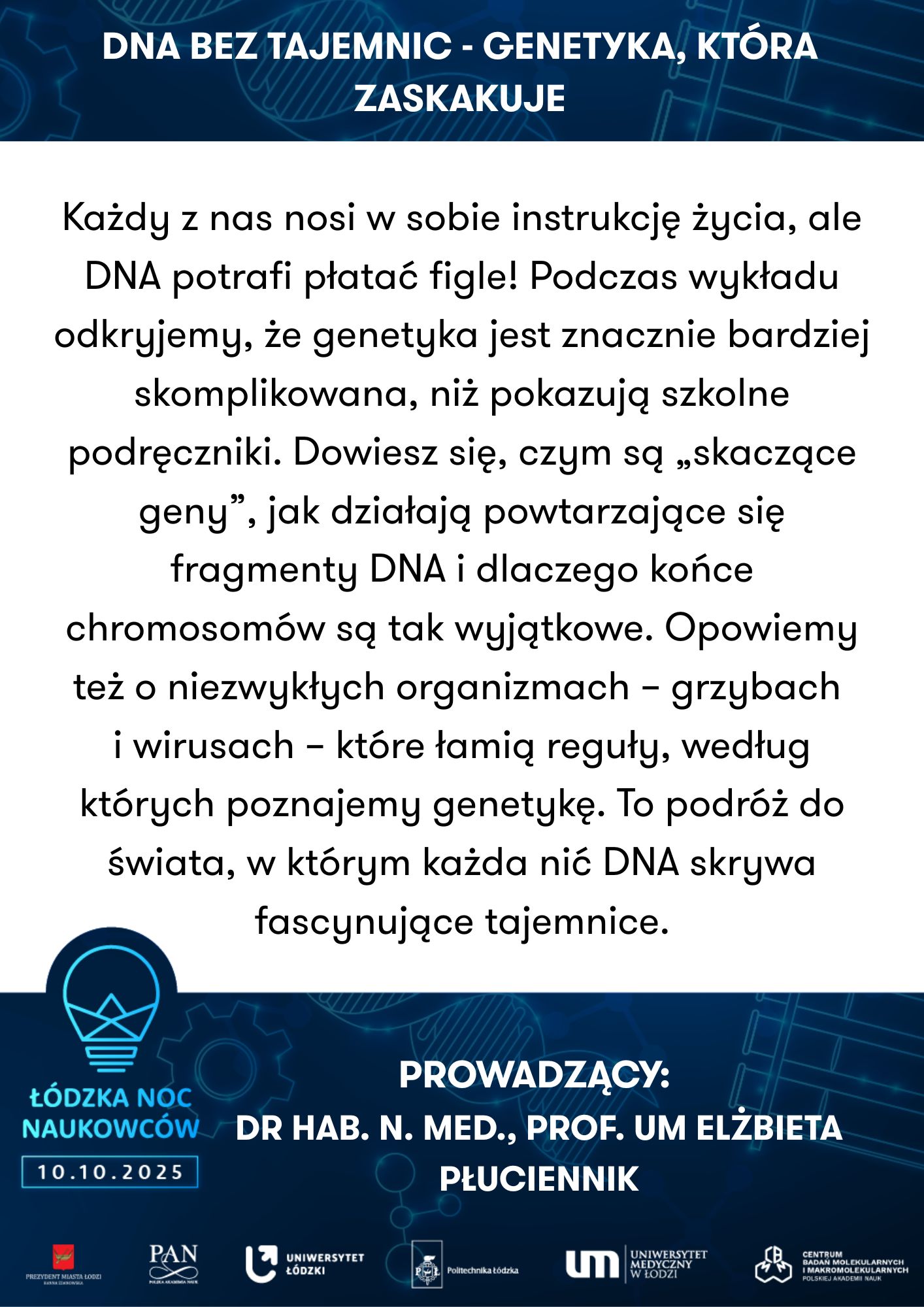 Uniwersytet Łódzki, Wydział Biologii I Ochrony Środowiska, Katedra Antropologii | Powrót do przeszłości – zagadki antropologiczne | Uniwersytet Medyczny w Łodzi, Zakład Genomiki Funkcjonalnej | Od żelaznego gada do lampy lawy - chemiczna podróż pełna eksperymentów | ||