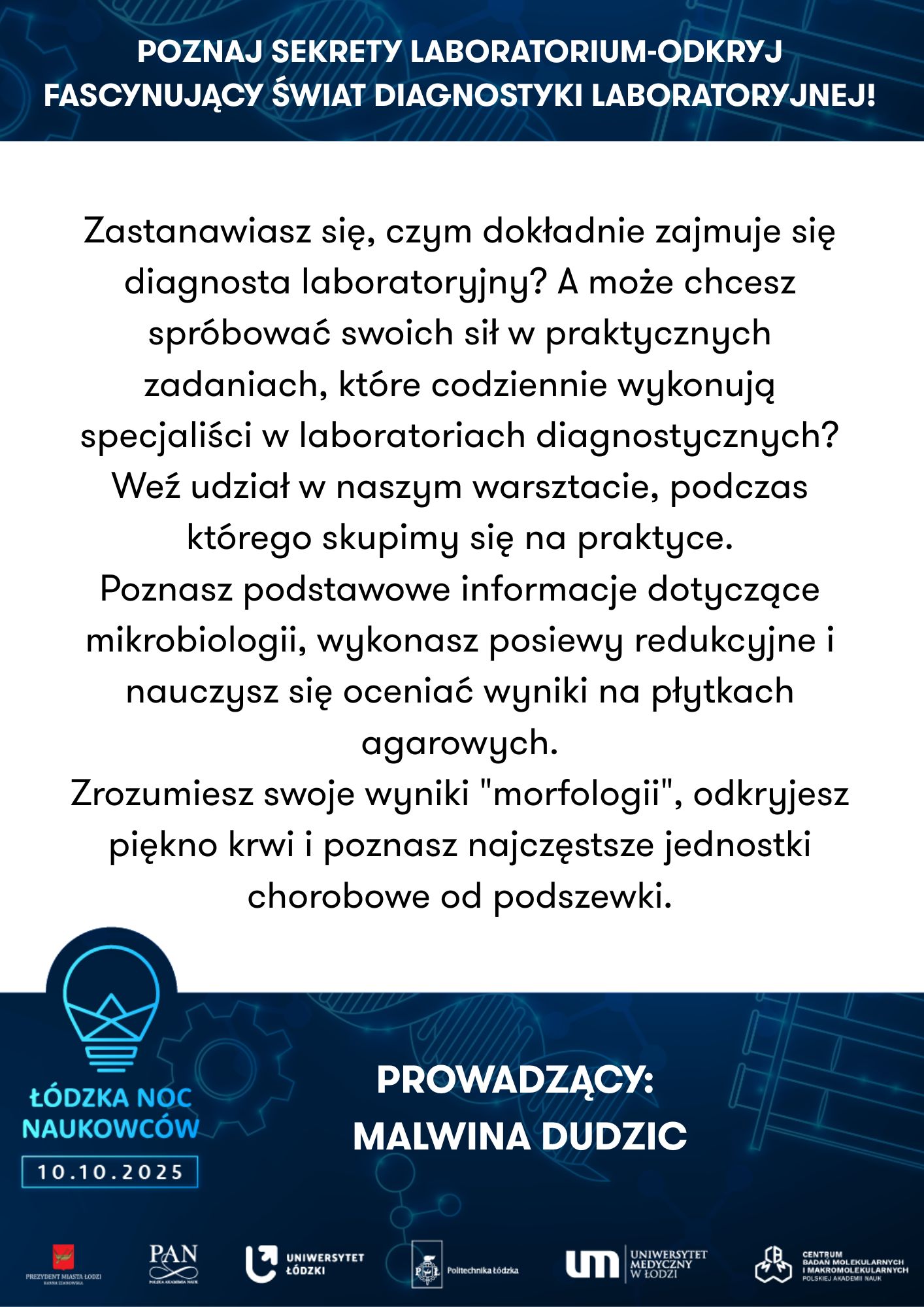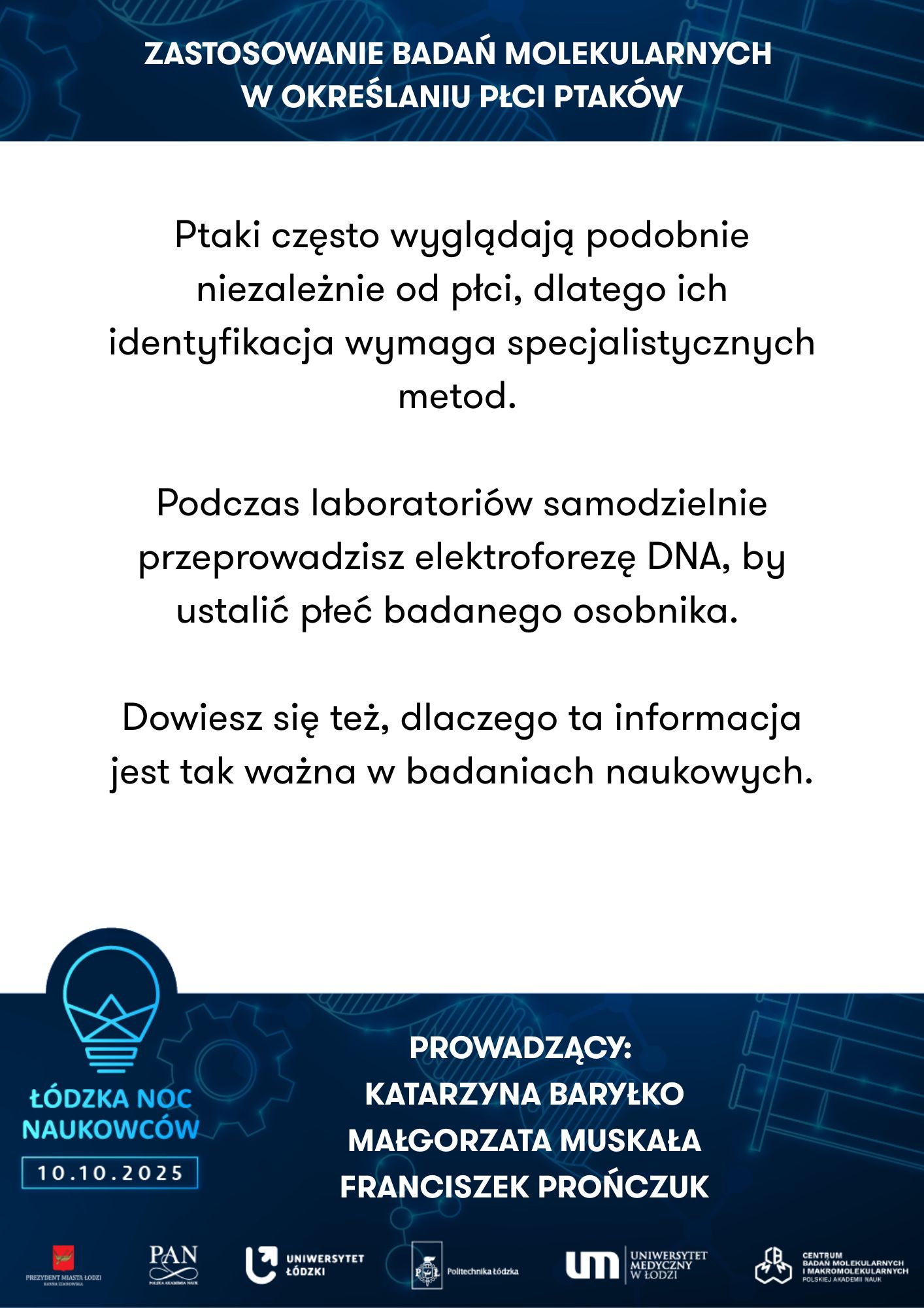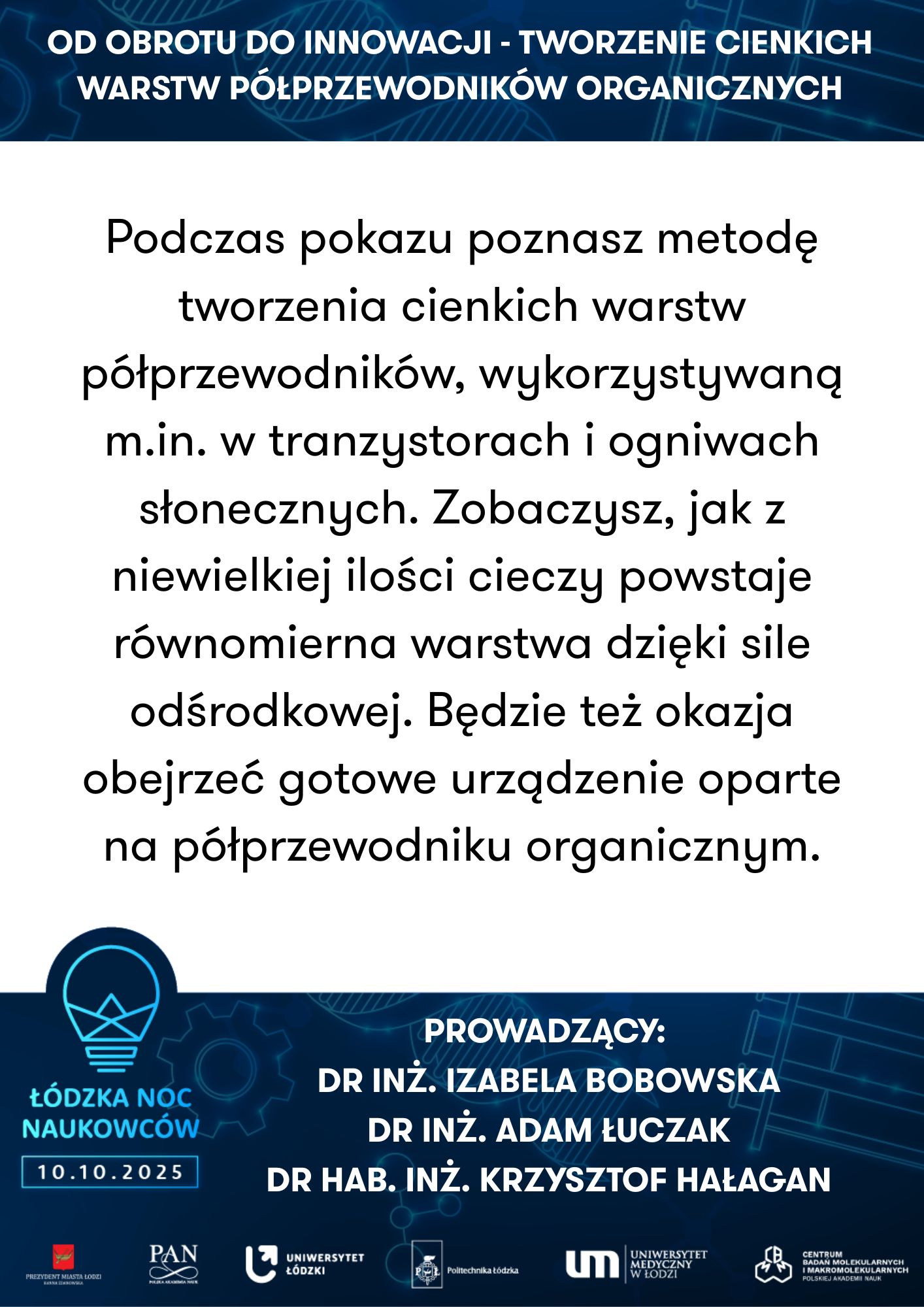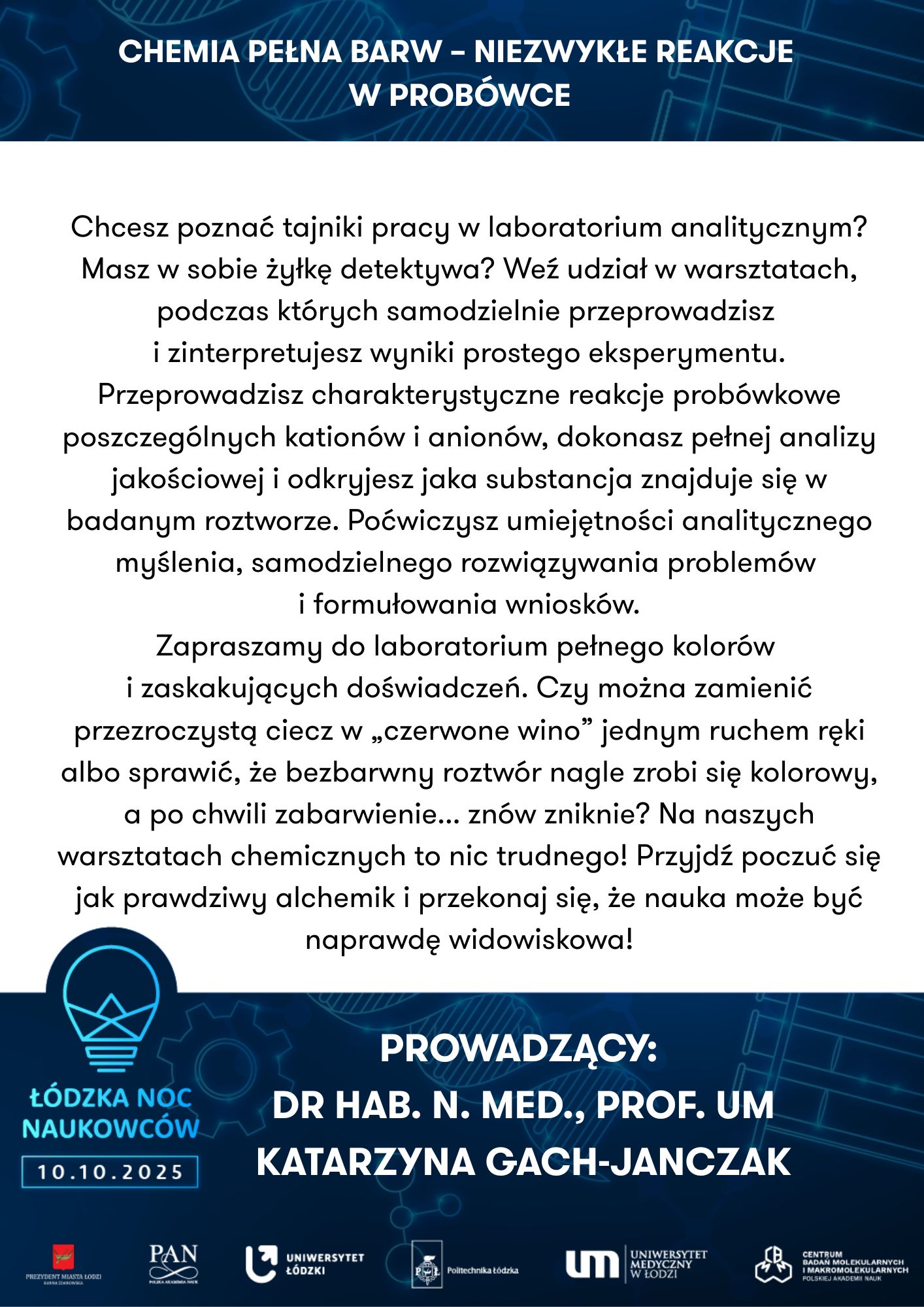 Nie zabraknie doświadczeń laboratoryjnych, podczas których będzie można własnoręcznie wykonać cienką warstwę półprzewodnika, zidentyfikować substancje organiczne w produktach spożywczych, przeprowadzić analizę miejsca zbrodni czy zbadać płeć ptaka na poziomie molekularnym – oczywiście pod czujnym okiem ekspertów z łódzkich uczelni i instytutów badawczych.