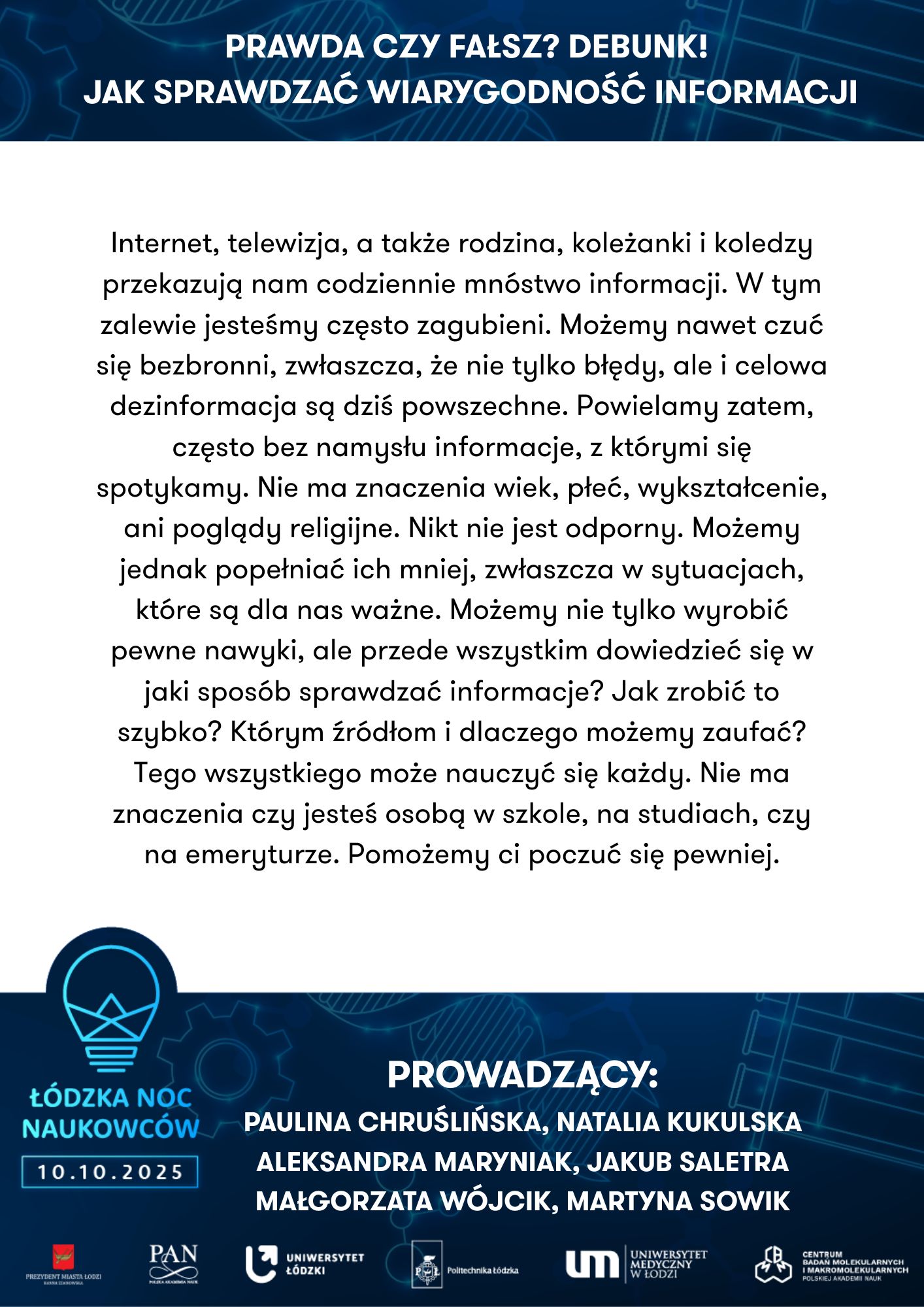 Prawda czy fałsz? Debunk! Jak sprawdzać wiarygodność informacji | 18:15-19:00 | Obowiązuje opłata rezerwacyjna 1 zł |