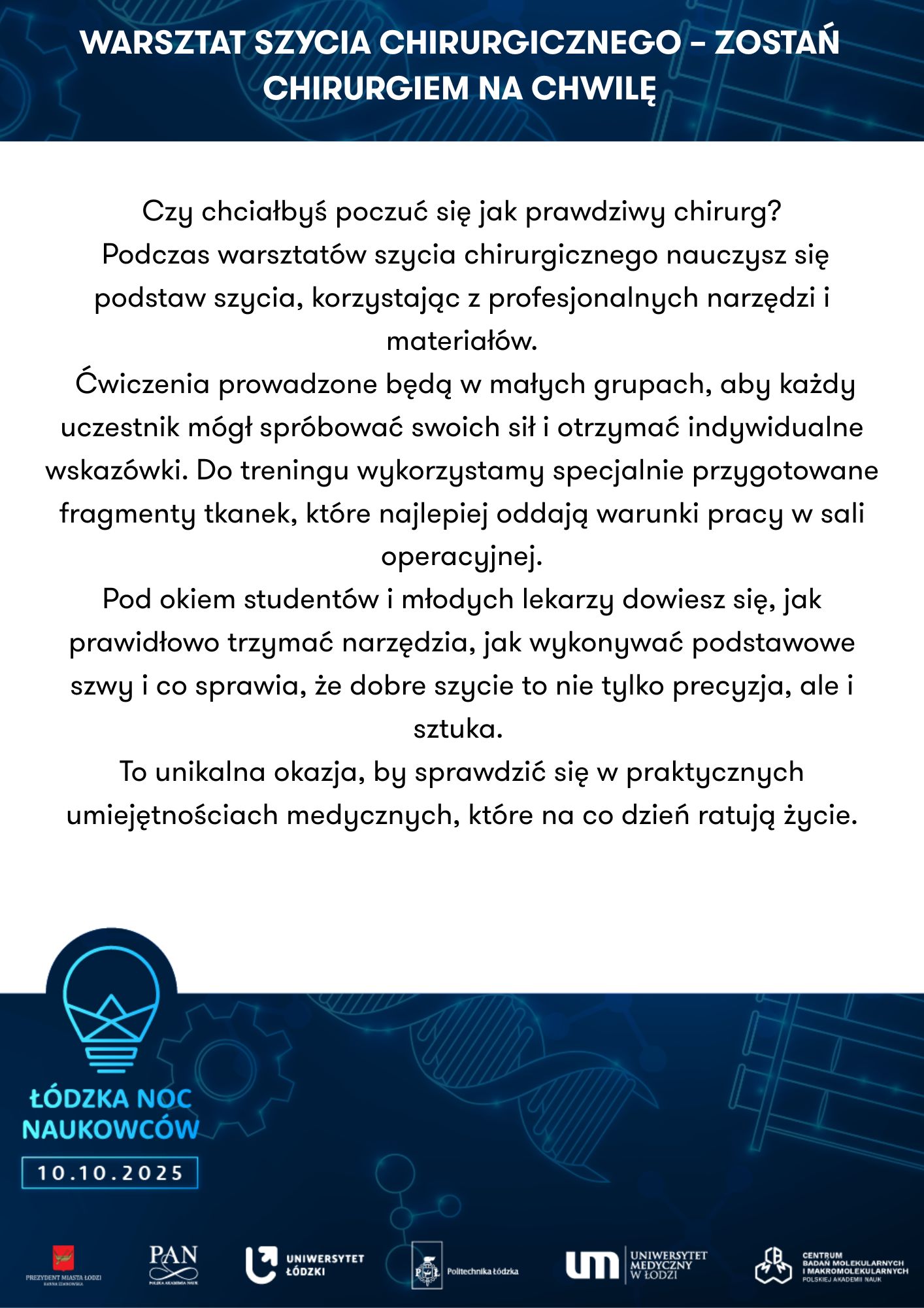 Warsztat szycia chirurgicznego – zostań chirurgiem na chwilę | 18:15 –19:45