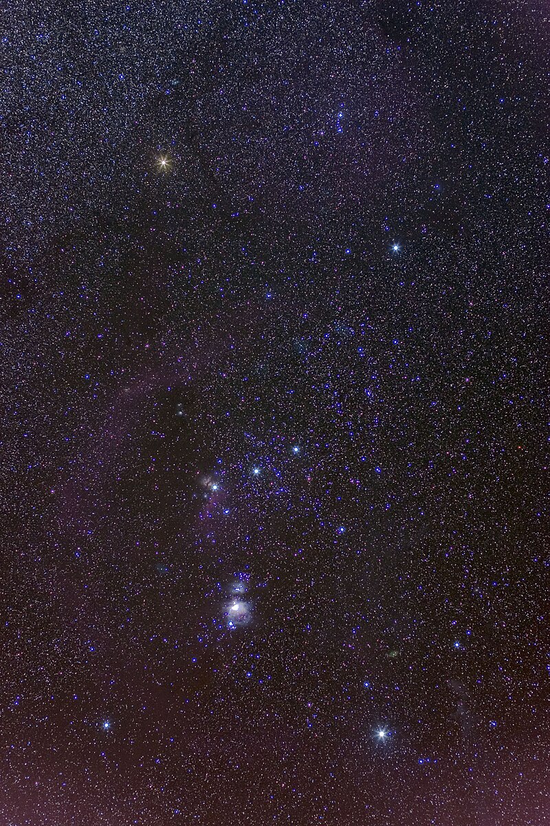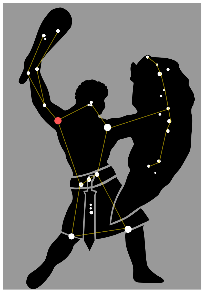 W Gwiazdozbiorze Oriona naszą szczególną uwagę zwróci jedna, jasna gwiazda o wyraźnym pomarańczowoczerwonym zabarwieniu, znajdująca się u góry, po lewej stronie gwiazdozbioru. To Betelgeza, prawdziwa gwiazda wśród gwiazd! Sławę zyskała dzięki dużemu prawdopodobieństwu zmiany w „gwiazdę supernową”. Najprościej mówiąc wiele osób czeka, aż Betelgeza wybuchnie. Byłoby to bez wątpienia najbardziej spektakularne wydarzenie astronomiczne w naszym życiu. Naukowcy spekulują, że ta gwiazda rzeczywiście eksploduje w niedalekiej, jak na kosmiczną skalę, przyszłości. Do wybuchu ma dojść w przeciągu najbliższych stu tysięcy lat. Choć prawdopodobieństwo jest nieduże, nie jest całkiem wykluczone, że będziemy mogli takie zjawisko zaobserwować jeszcze za naszego życia. Istnieje także prawdopodobieństwo, że taka eksplozja mogła mieć już miejsce, a jedynie jej światło jeszcze do nas nie dotarło, choć astronomowie raczej negują taki rozwój wydarzeń. Betelgeza jest oddalona od Ziemi o około 600 lat świetlnych, a więc obserwujemy ją taką jaką była około 600 lat temu. Nie posiadamy dokładnych danych na temat odległości do Betelgezy, gdyż jest ona gwiazdą dość problematyczną, jeśli chodzi o określenie dokładnej odległości ze względu na jej zmienność.