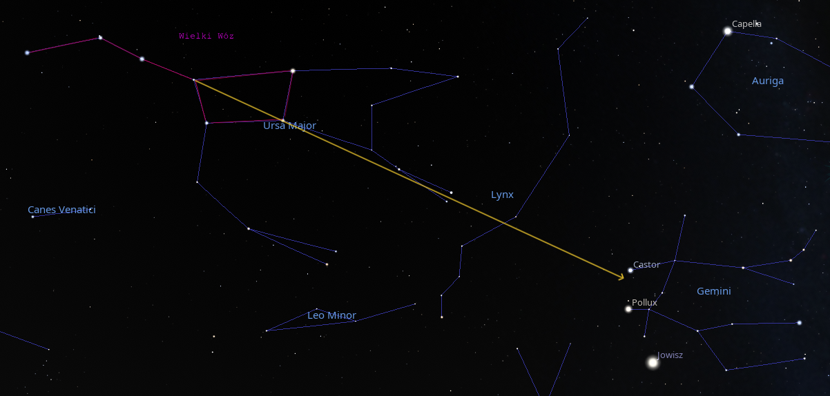 Pozostawiając już Oriona, spojrzymy jeszcze w kierunku gwiazdozbioru Bliźniąt. W jego odnalezieniu może pomóc nam Wielki Wóz, czyli chyba najbardziej znany, nieformalny kształt na niebie – asteryzm. W rzeczywistości Wielki Wóz jest po prostu fragmentem kształtu gwiazdozbioru Wielkiej Niedźwiedzicy. Gdy odnajdziemy już Wielki Wóz i przeciągniemy linię półprostą, łączącą jego dyszel z tylnym kołem, w stronę tyłu wozu, natrafimy na dwie jasne gwiazdy niedaleko siebie. To Polluks (poniżej) i Kastor (powyżej) – dwie najjaśniejsze gwiazdy gwiazdozbioru Bliźniąt, które symbolizują dwie mitologiczne postacie o takich właśnie imionach. Według starożytnych Greków byli to dwaj bracia, będący wzorem braterskiej miłości. Gdy Kastor w pewnej bitwie poległ martwy, Polluks nie chciał pozostać bez niego na świecie, dlatego Zeus przeniósł ich razem między gwiazdy. W kształcie tego gwiazdozbioru rzeczywiście można dopatrzeć się dwóch postaci trzymających się za ręce.