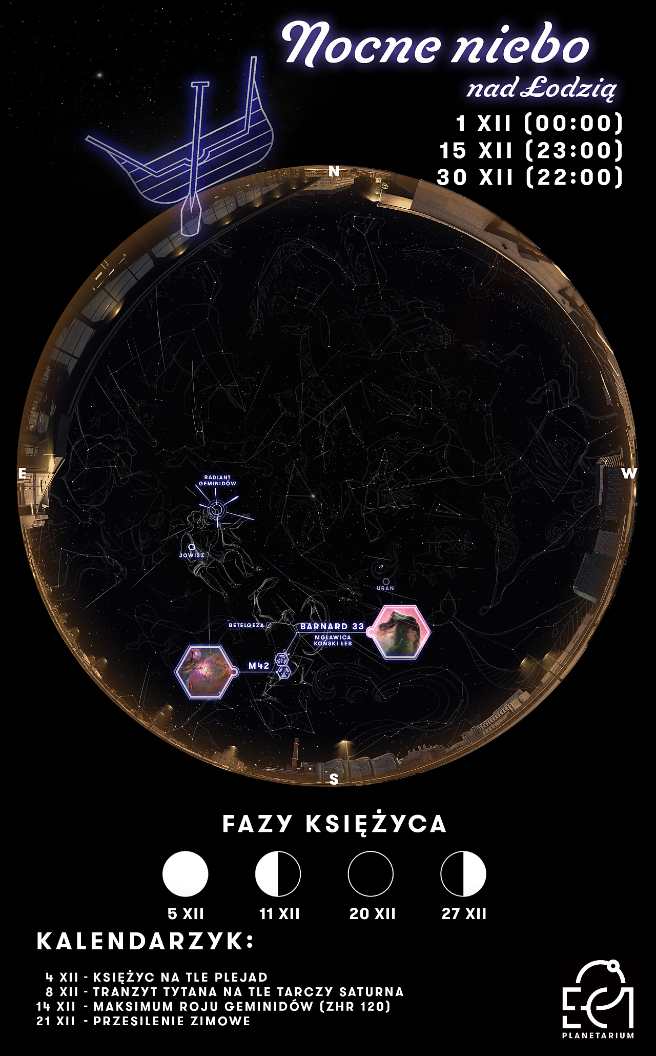 Grudzień, choć w większości jeszcze jesienny, to powoli, z nocy na noc coraz wcześniej ukazuje nam już zimową część nieba. To właśnie w grudniu zaczyna być widoczny wieczorami Gwiazdozbiór Oriona, chyba najbardziej charakterystyczny kształt na niebie. Dla wielu jest wręcz symbolem zimy, obok śniegu, nart i lepienia bałwana. Spędzamy pod nim każdy, pogodny zimowy wieczór. Często jest kojarzony też ze świętami, prawie jak choinka czy świąteczne lampki, bo towarzyszy nam przez cały ten wyjątkowy czas. Niektórym przypomina klepsydrę, innym przewróconą na bok kokardę, jednak w rzeczywistości przedstawia on Oriona – mitologicznego łowcę, który był tak olbrzymi, że gdy stąpał po dnie morza to głowę miał ponad falami.