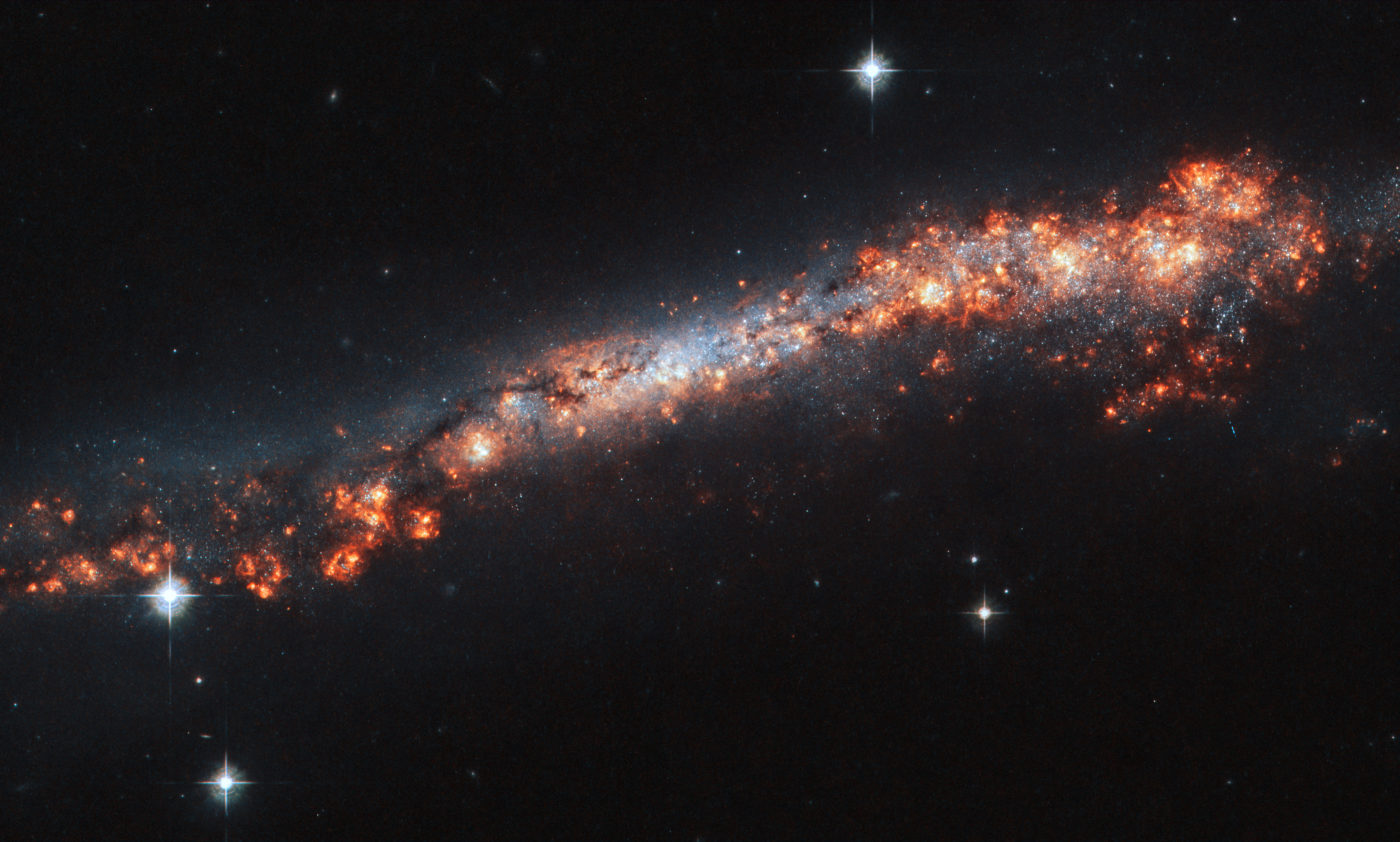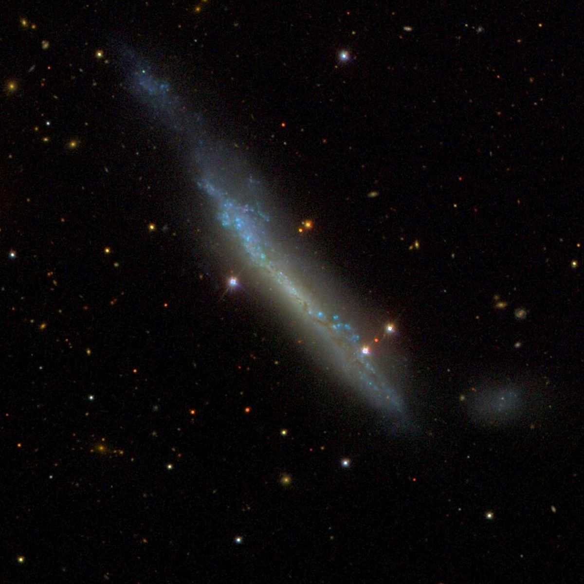 Zerkając bardziej w stronę zenitu, do gwiazdozbioru Małego Lwa, napotykamy NGC 3432. Jest to niewielka galaktyka spiralna, którą widzimy ustawioną niemal dokładnie krawędzią do nas. Jej smukły kształt sprawia, że w teleskopach amatorskich prezentuje się jako delikatne wrzeciono. NGC 3432 jest częścią układu Arp 206. (Przypomnijmy, że Arp to katalog galaktyk osobliwych). Jej kształt jest wyraźnie zniekształcony przez grawitacyjne oddziaływanie z pobliską galaktyką karłowatą UGC 5983. Te potężne siły pływowe prowokują gwałtowne procesy gwiazdotwórcze. Dodatkowo w tej galaktyce zaobserwowano niezwykły obiekt – SN 2000ch. Początkowo sądzono, że to supernowa, jednak gwiazda ta wybuchała wielokrotnie w ciągu kolejnych lat. To rzadki przykład gwiazdy zmiennej typu S Doradus, która przechodzi przez gwałtowne okresy utraty masy, walcząc o przetrwanie przed supernową.