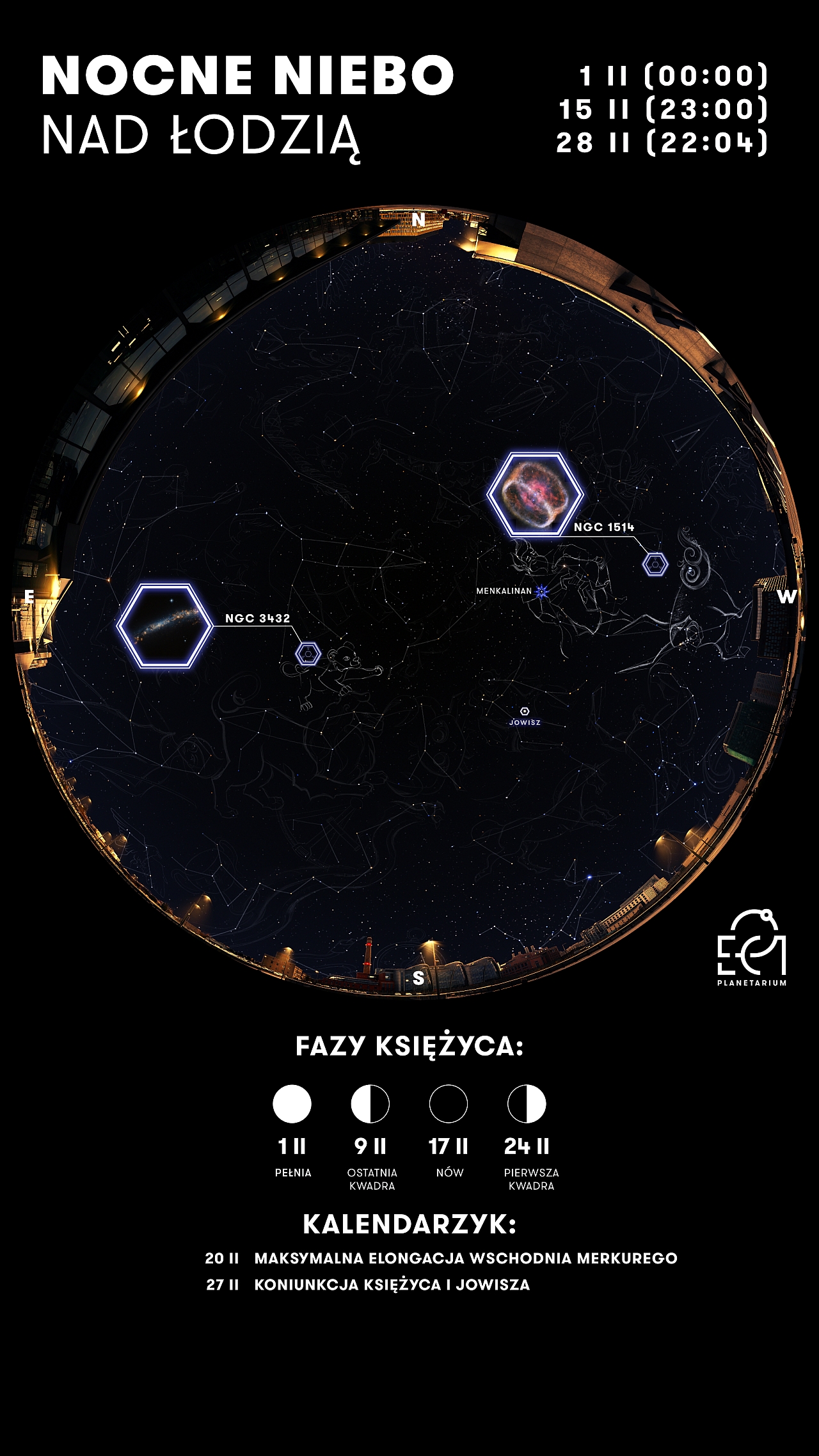 Charakterystycznym punktem nieba będzie Jowisz, przebywający w gwiazdozbiorze Bliźniąt. Warto również śledzić zbliżenie tej planety do Księżyca, do którego dojdzie 27 lutego. Jowisz znajdzie się w pobliżu jasnych gwiazd - Kastora i Polluksa, tworząc niezwykle estetyczny układ. Z bardziej wyrafinowanych zjawisk, 20 lutego Merkury znajdzie się w swojej maksymalnej wschodniej elongacji, co oznacza, że oddali się od Słońca na niebie na tyle, by stać się widoczny nieuzbrojonym okiem nisko nad zachodnim horyzontem na krótko po zmierzchu.